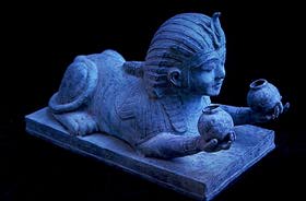 little sphinx just 4 inches long carved from dark grey schist stone from the 16th Dynasty, that is 2255-2246 BCE. The statue is identified as The