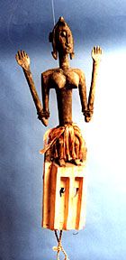 Satimbe Mask Dance Goddess Wood and Jungle Rope H 37 inches W 13 inches Dogon Culture Mali, Subsaharan Africa $1,250 The goddess, Satimbe, taught the Dogons of sub-Saharan Africa their dances and the art of mask-making. She is also called Yasigine, elder sister of the masks and always plays an essential role in the Awa (secret society) rituals. During the Dama ceremony, dancers in archetypal masks reenact the mythological relationship between the people, nature and powerful ancestors. "Images of the Goddess," one of several current exhibitions at Inspired Planet, includes jewelry, masks, temple statues, icons and textiles. |