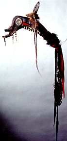 Horse jaw, beads, fur, steel, feathers and trade cloth